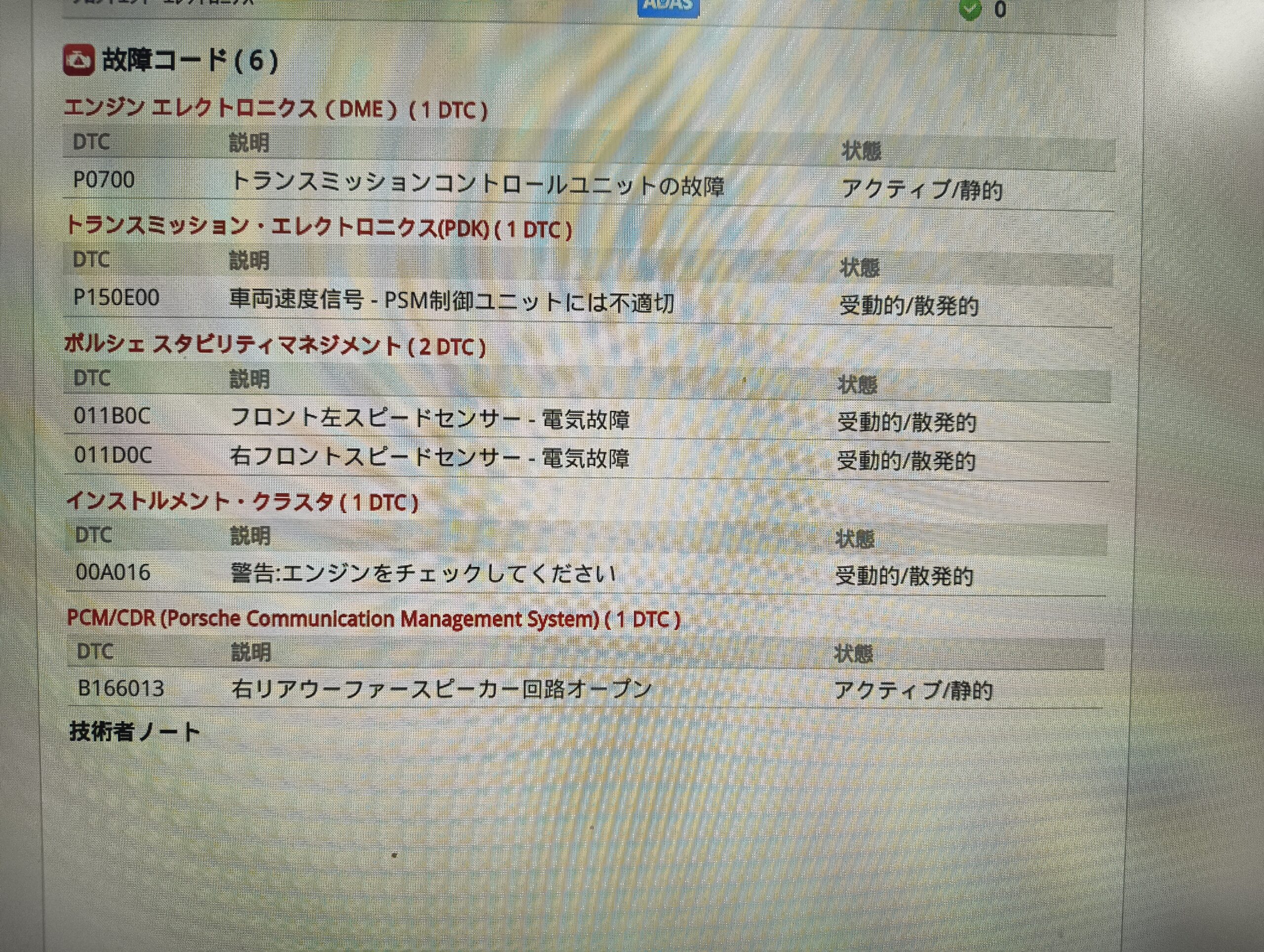 最初はこんな感じの警告で、テスターで診断してみると左フロントのスピードセンサーが不良の様子でした。