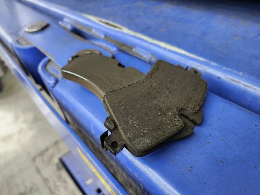 実際にフロントブレーキを点検すると、ブレーキパッドの残量は3ミリほどでした。