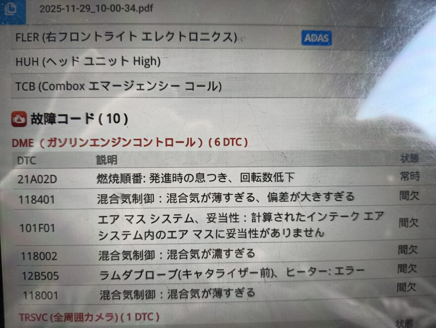 大阪府K様 BMW F31 320i エンジンチェックランプ点灯修理