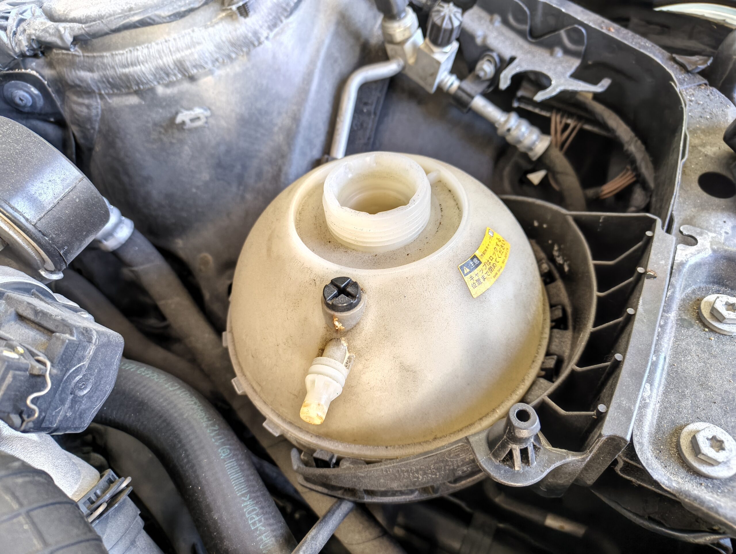 上部の黒い+のエア抜きプラグ下に亀裂が入っており、そこから冷却水が滲みだしています。