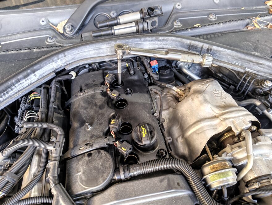 車検整備でご入庫中の大阪府T様のお車、BMW F20 116iの整備作業進行中です。