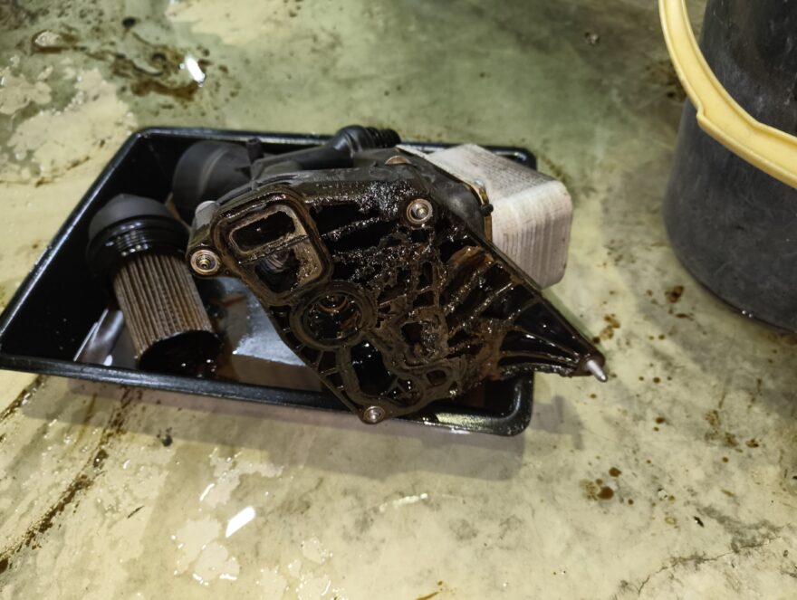 オイルフィルターブロックを外してみたら、ドロドロのグチャグチャな状態。