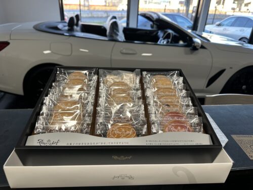 H社長のBMW X6のオイル交換にてご来店頂き、差し入れ頂戴致しました。