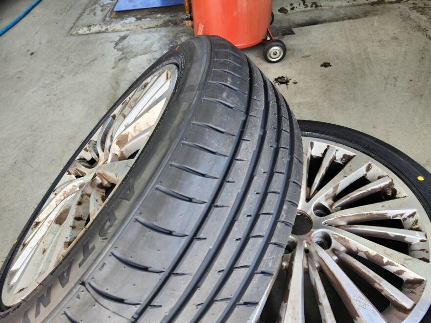 リア側をタイヤ交換しましたが、交換したタイヤをフロントに付けローテーションしておきます。