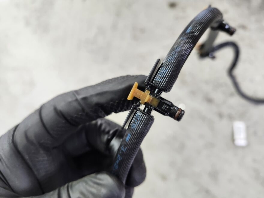 さらに点検を進めると、インジェクターからのリターンホースの取付部のクリップが欠けています。