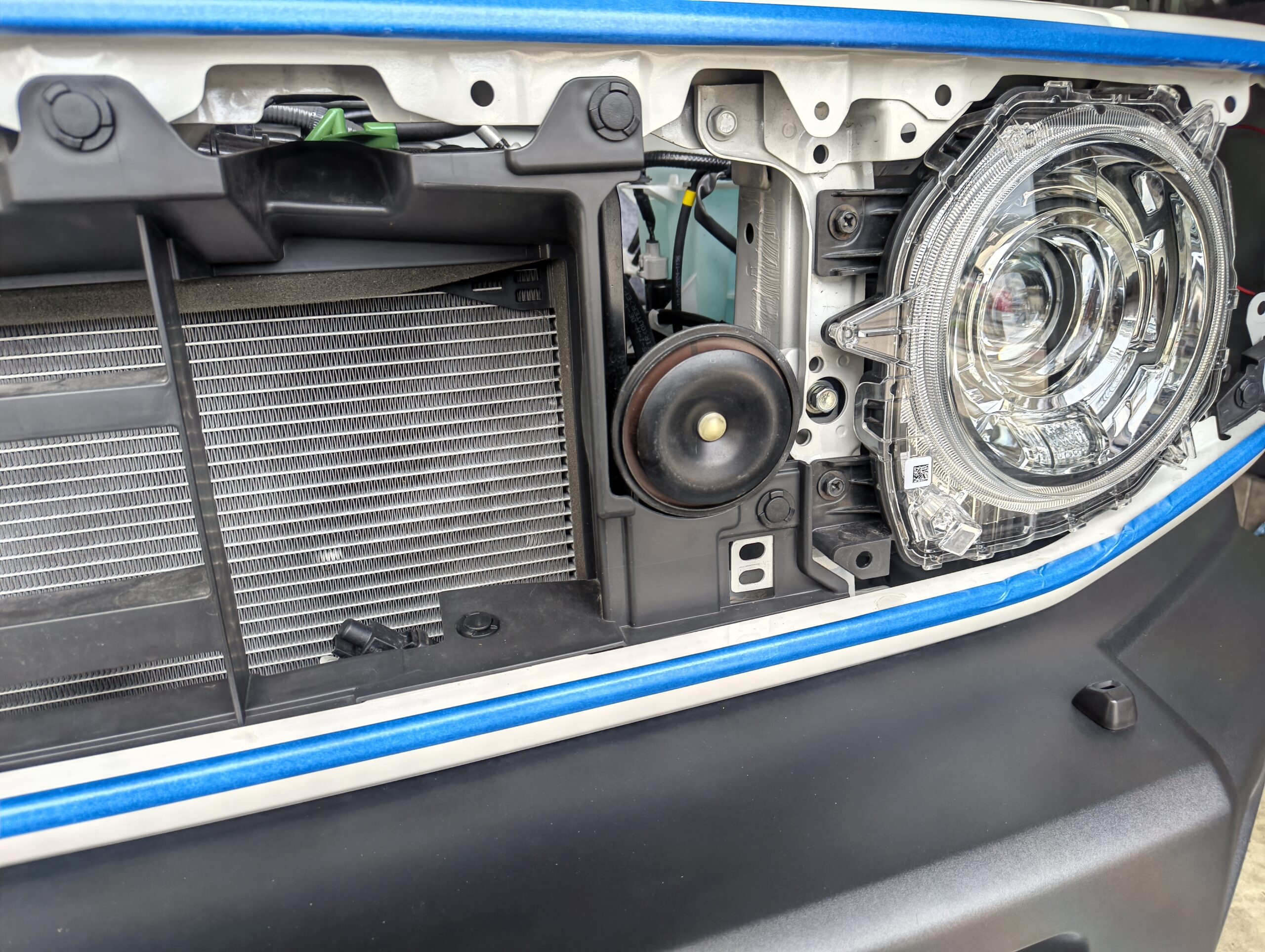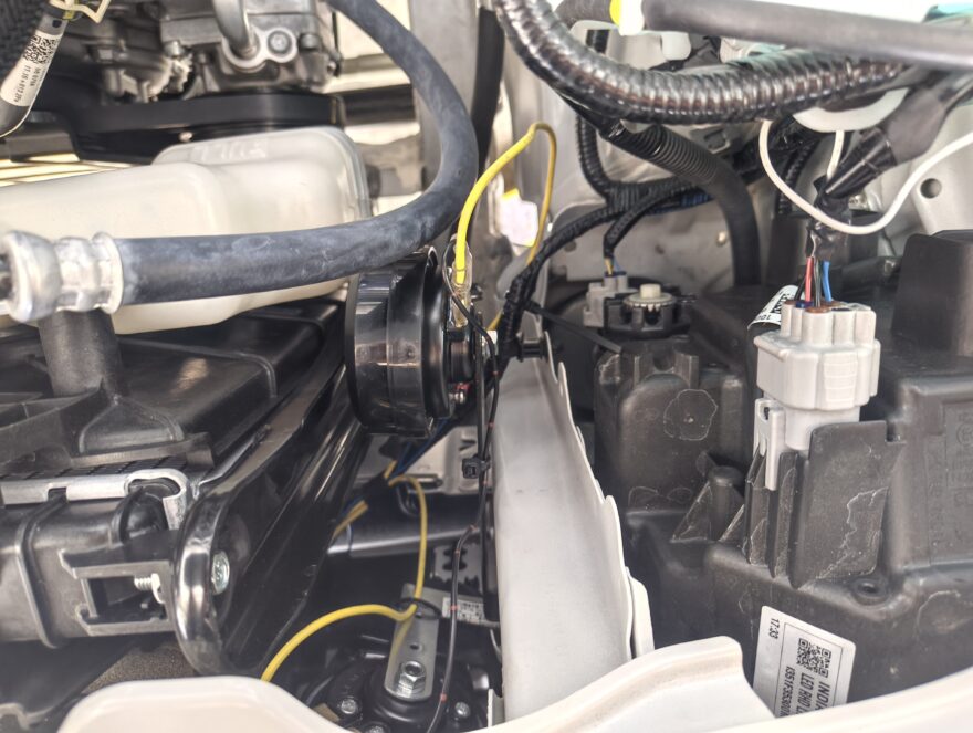 内側のホーンはラジエターのブラケットに干渉するのでスポンジテープで対処してあります。