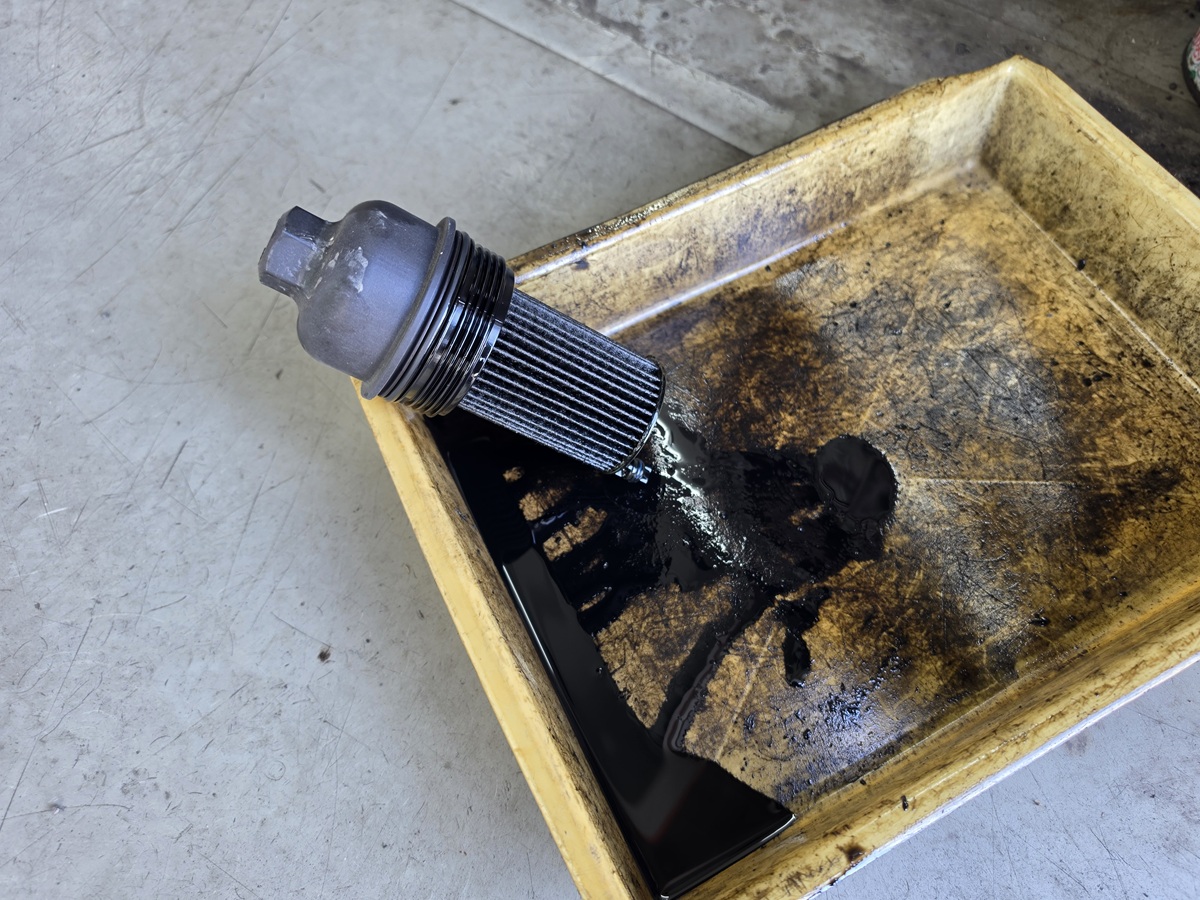 準備していたオイルフィルターを取付け、オイルレベルゲージで確認しながらエンジンオイルを補充します。
